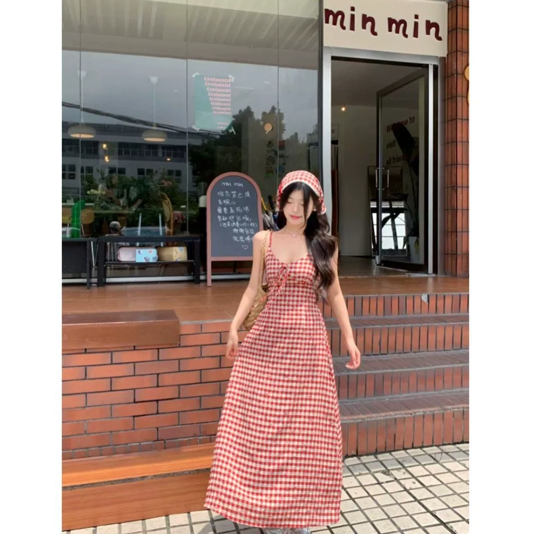 Backless Long Red Checked Dress