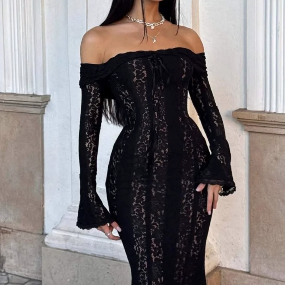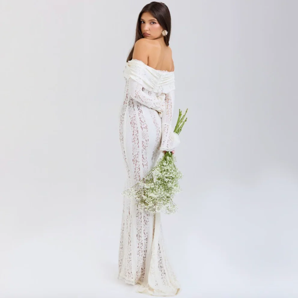 Off Shoulder Lace Long Maxi Dress - White & Black